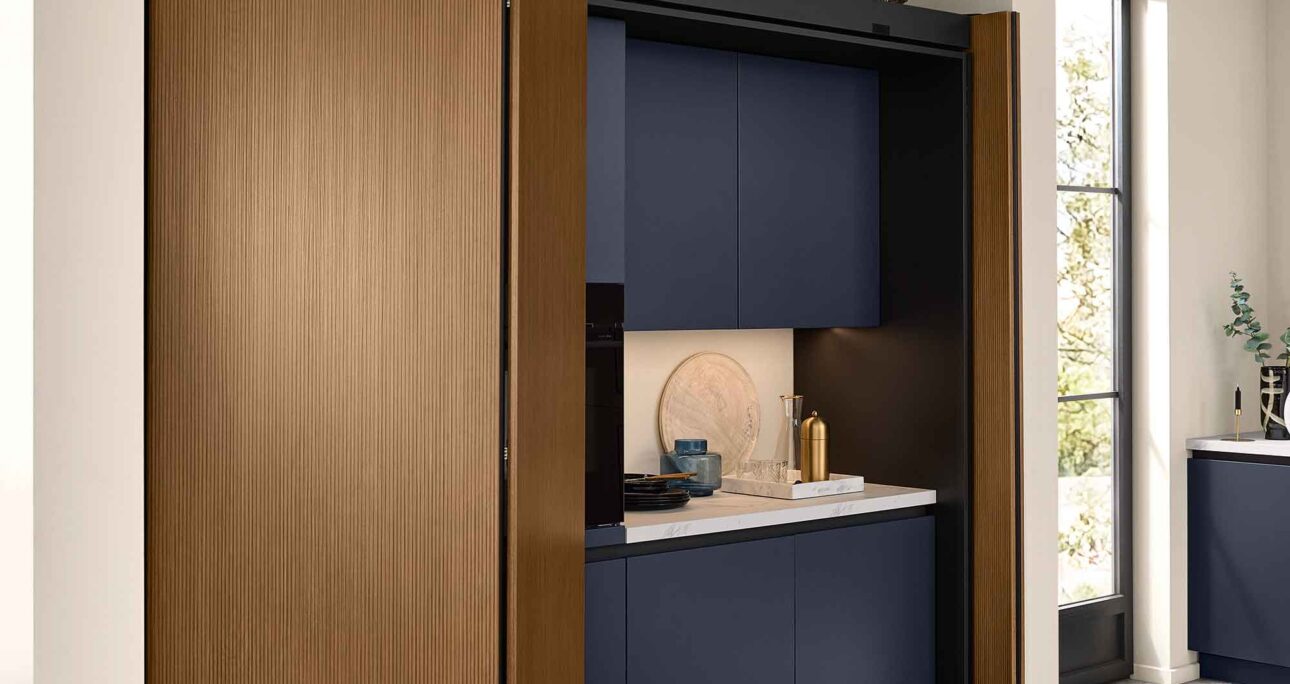Die cleveren Pocketdoors lassen komplette Funktionsbereiche wie Elektrogeräte oder Regale elegant hinter einschiebbaren Türen verschwinden. Geschlossen entsteht ein aufgeräumtes, wohnliches Gesamtbild – perfekt für multifunktionale Räume und offenes Wohnen.