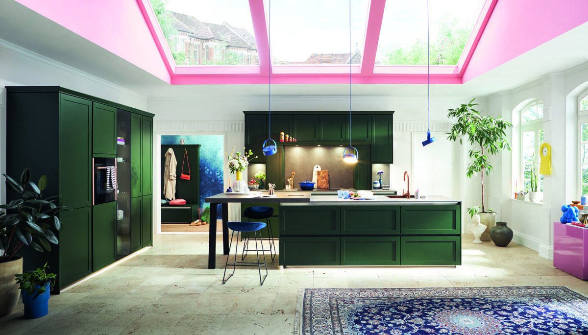 Rahmenfronten in Waldgrün Satin und Basalt Graphit schaffen ein stilvolles Ambiente. Der beleuchtete Vitrinenschrank präsentiert Lieblingsstücke, der Multifunktionsaufsatzschrank bietet versteckten Stauraum. Der zweigeteilte Spülenunterschrank sorgt für Ordnung und Funktion – elegant, praktisch, harmonisch.