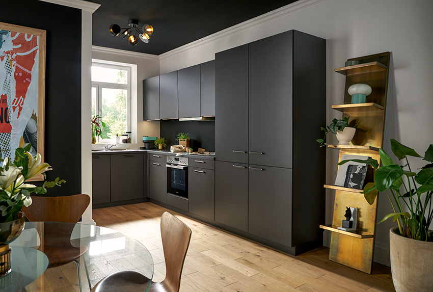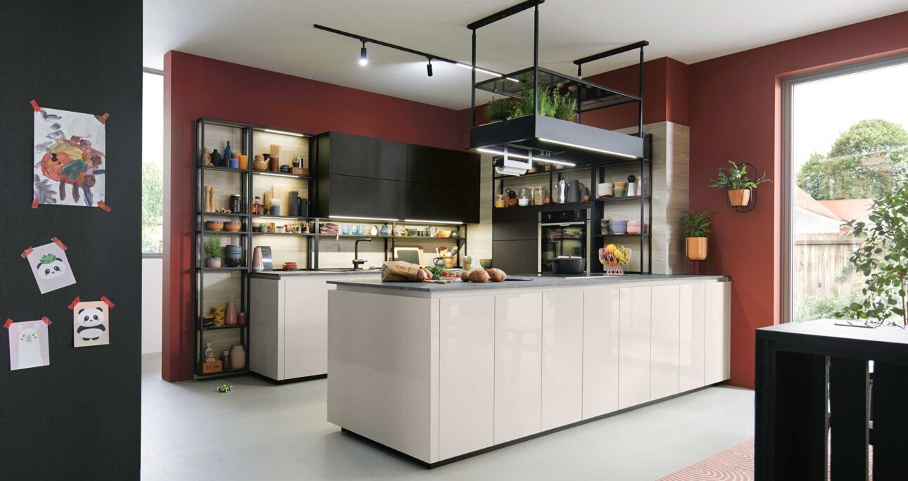 Schwarz trifft auf Weiß – und schafft zeitlose Eleganz. Onyxschwarze Holzdekore und muschelweiße Fronten wirken modern und ausgewogen. Offene Frame Rack Regale lockern das Design auf. Komfort bringen hochgebauter Geschirrspüler, Sockelbeleuchtung und die intuitive C-Drive Öffnungsunterstützung.