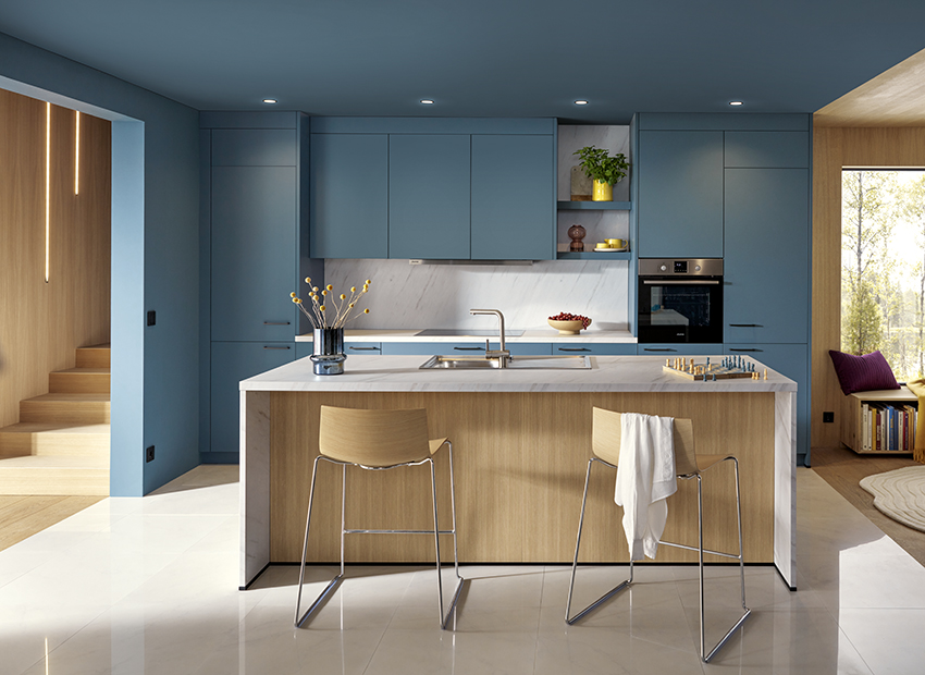 Die nächste Generation von Schüller Küchen verbindet Ästhetik und Umweltbewusstsein. Matte Fronten in Kieselgrau mit Anti-Fingerprint-Eigenschaft und lebhaften Akzenten schaffen eine einladende Atmosphäre. Das Frontmaterial besteht zu 71 % aus recycelten Rohstoffen, während nachhaltige Komponenten wie OrganiQ-Einsätze oder Griffe aus OceanIX Plastic den ökologischen Anspruch unterstreichen. Raffinierte Details – etwa frontbündige Deckenblenden, ein Frame-Rack-Regal mit Schiebetür oder ein Ecklifter für Küchenmaschinen – verbinden Komfort mit Design.