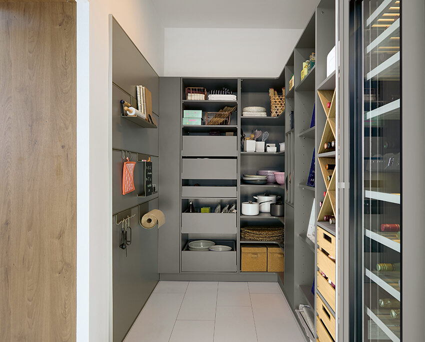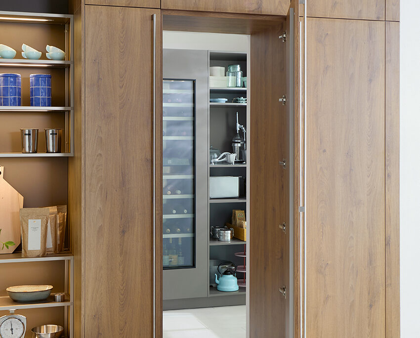 Eine gut geplante Speisekammer sorgt für Struktur und Ruhe im Küchenalltag. Schüller integriert sie elegant in das Gesamtkonzept – etwa mit verdeckten Durchgangstüren, die sich nahtlos in die Küchenfront einfügen. So entsteht zusätzlicher Stauraum, ohne das Design zu unterbrechen.