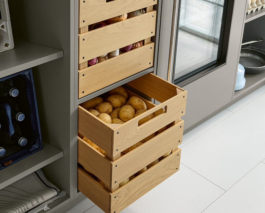Hochschranklösungen mit Auszügen in Eiche natur bringen Wärme und Struktur in die Speisekammer. Im rustikalen Kistenlook bieten sie idealen Platz für Lebensmittel wie Kartoffeln oder Zwiebeln. Das natürliche Holz sorgt für eine angenehme Atmosphäre und verleiht dem Raum eine wohnliche Note.