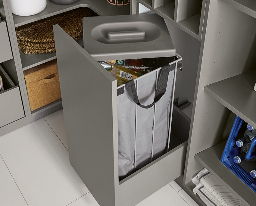 Auch beim Thema Nachhaltigkeit denkt Schüller mit: Spezielle Recyclingschränke und -taschen ermöglichen das einfache Trennen von Papier, PET-Flaschen oder Dosen – stilvoll integriert und platzsparend. So bleibt Ihre Küche nicht nur ordentlich, sondern auch umweltbewusst organisiert.